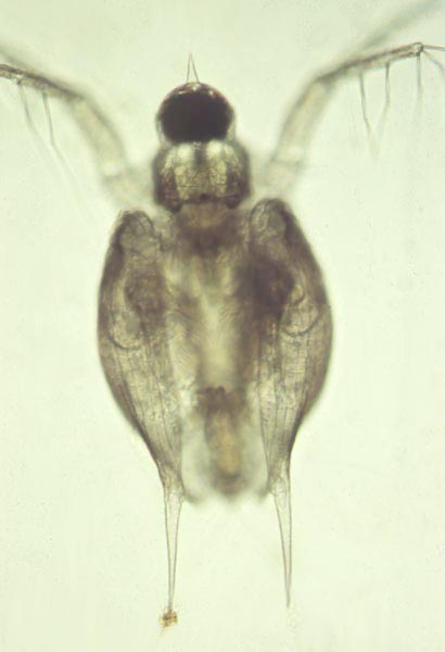 Ventral valve rim straight, with mucro. Large compound eye, point-like nauplius eye.