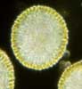 The Chrysomonadina (syn. Chrysophyceae) are small flagellates with yellow-brownish plastids. This is due to the overlay of chlorophyll a by fucoxanthine. Two flagellae with unequal length originate at the anterior side, the longer of which is applied with two rows of stiff mastigonemes while the shorter has only few hairy extensions. To survive inactive periods, chrysomonads make endocysts bearing a single cell. Energy storage material is chrysolaminarin (= polysaccharide leukosine) or oils, not starch. In case of food scarcity, some species can switch to heterotropic mode, making pseudopods to phagocyte other small protists. Chrysomonads are inhabitants of both, limnic and marine systems. There are speculations putting chrysomonads as the basic group for color-less flagellates, rhizopods and multicellular algae. |