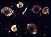 | Like testacea, foraminifera possess a shell. This can be monothalamous (single-chambered) or polythalamous (multi-chambered). The shell is made of organic material which incorporates chalk, grains of sand or other things. The chambers are built successively and are connected to both, the following chamber as well as to the extracellular space. Reticulopods are predominant and can extend from the terminal aperture or from the pores in each chamber. "Granular streaming", the intracllular movement of vesicles, mitochondria or other cellular components along the pseudopods, which contain bundles of microtubules, can be frequently observed. Propagation can be sexual or asexual, in some species also heterogony has been observed. Foraminifera are facultatively marine and live mostly in coral reefs, on rocky shores or in sandy ground as part of the mesopsammon. Many species contain zooxanthellae. Foraminifera have an important ecological function as main source of marine sediments. |