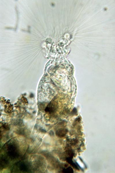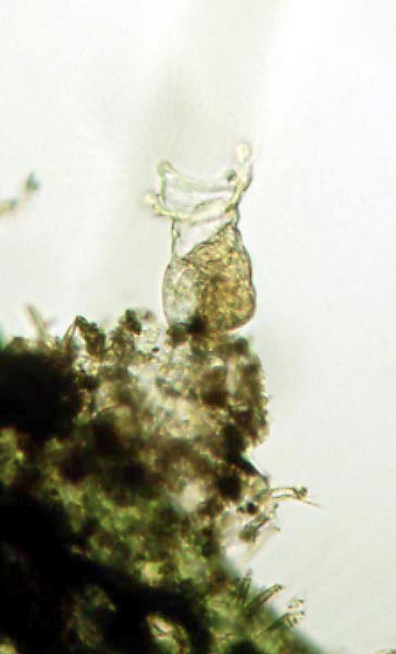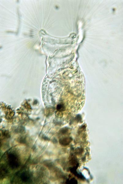 Feeding Collotheca female. A female in the relaxed state waits for prey. Sensing a ciliate, the crown is closed and the prey ingested. Then, the animal is again in the relaxed state. | |